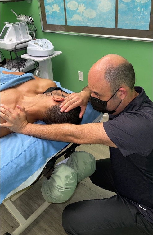 Esta sesión se concentra en el masaje y el estiramiento y la aplicación de termoterapia en los músculos del cuello y los hombros, sin embargo, dependiendo de la duración de la sesión programada puede incluir más áreas del cuerpo o el cuerpo entero..